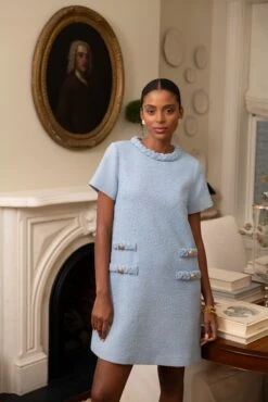 Inspired by the great style icon, Jackie Kennedy, the Jackie Dress is crafted from thoughtfully curated details for a timeless closet staple piece. The shift silhouette creates the perfect blank canvas for the textured tweed fabric and luxe braided trim along the neckline and faux front pockets for a look that feels tailored but wears effortlessly. Adorned with gold crest buttons for a vintage touch, this mod mini wears just as well to brunch as it does running the boardroom.