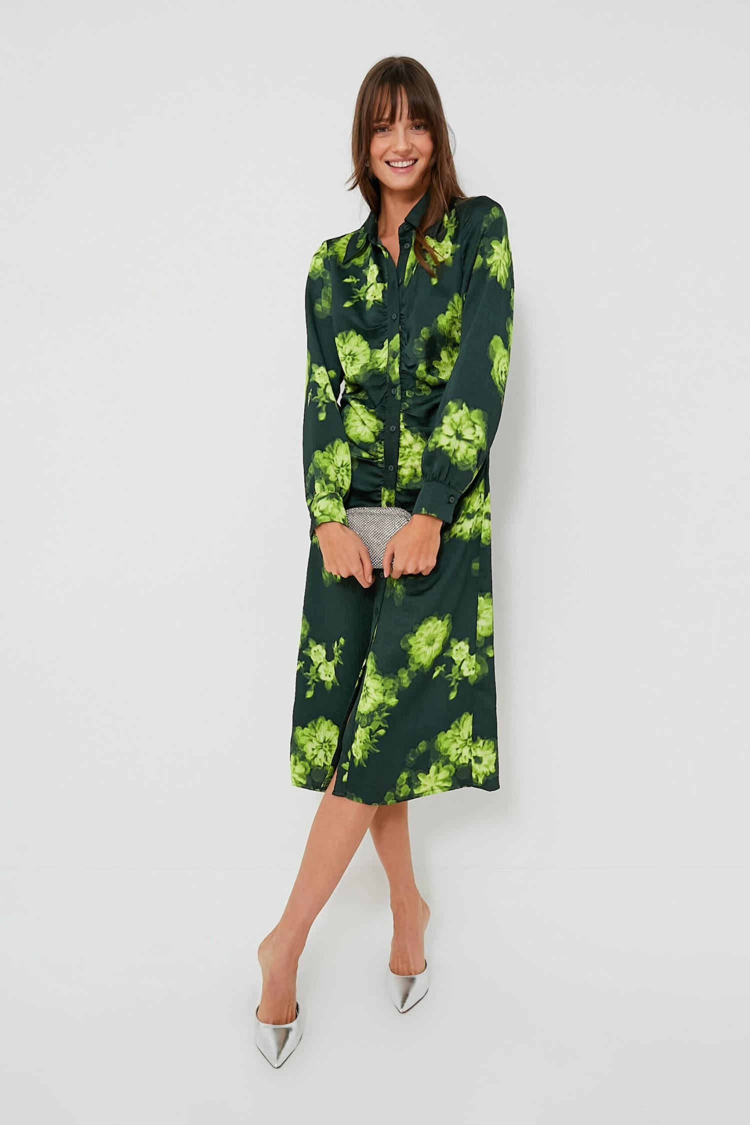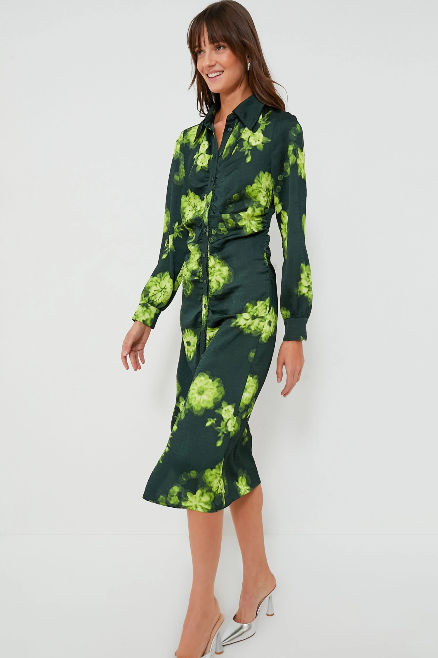 Elevate your style effortlessly with this statement piece – the Margot Flower Abira Dress, perfect for making a lasting impression. Featuring luxe green hue, this midi can be dressed up or down, season after season. This fitted style seamlessly combines sophisticated details like a front button closure, buttoned cuffs and ruching at the sides to give a flattering drape. From sandals to sneakers, heels to flats, we are constantly reaching for this maxi for easy day to night transitions, desk to drinks, and everything else all season long.