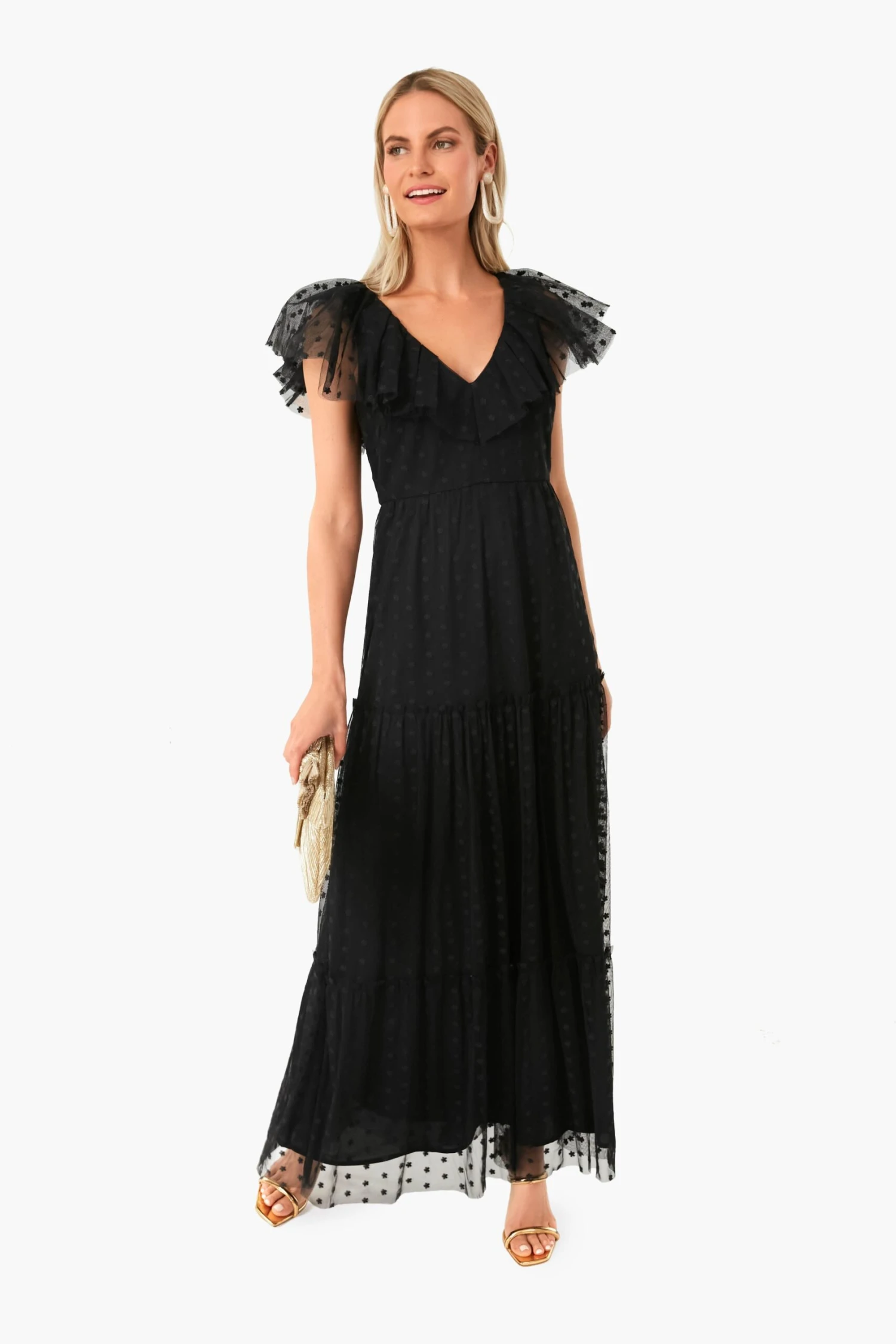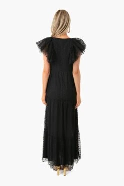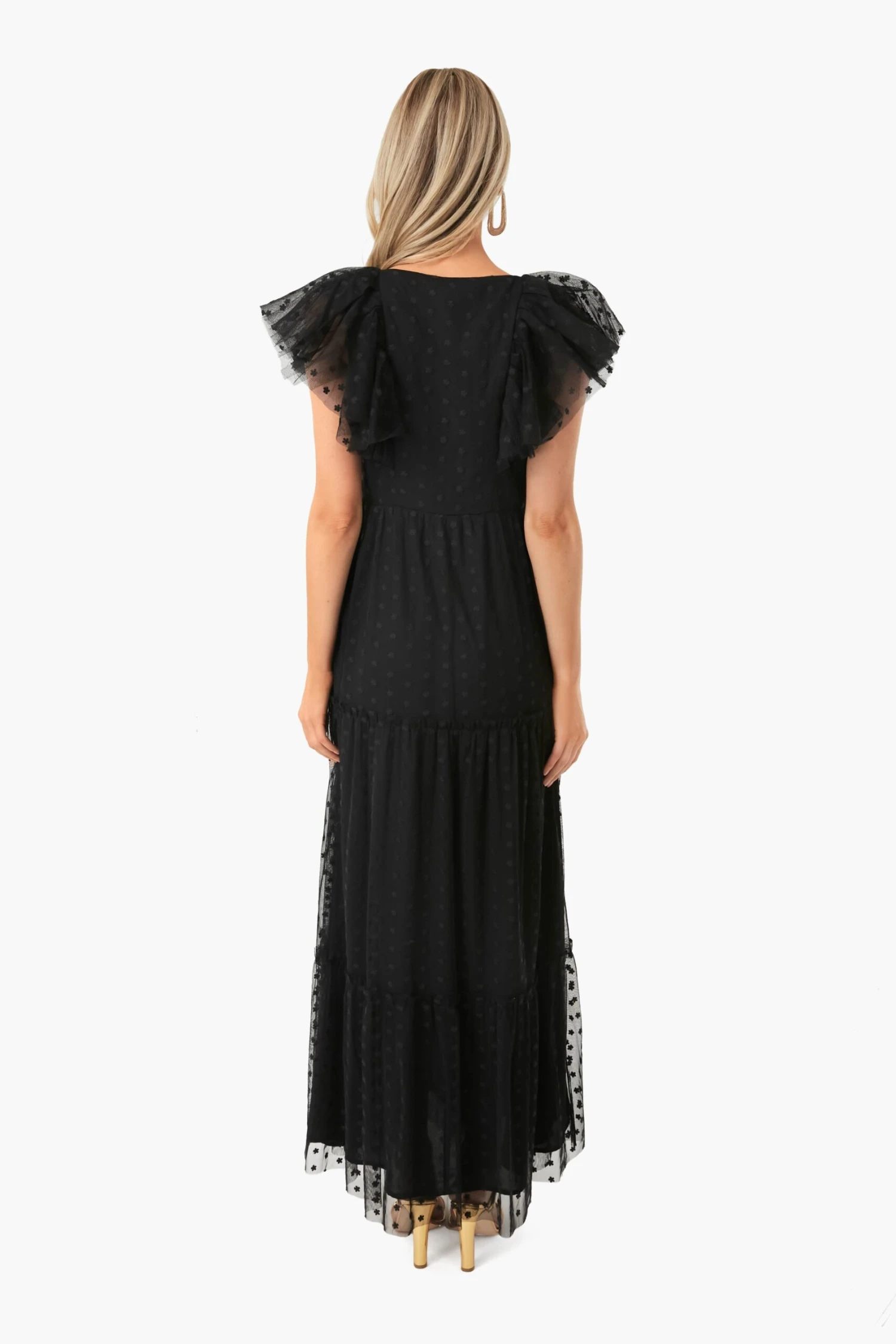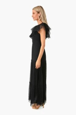 Fall in love with the Black Onyx Tulle Giselle Gown. Made to celebrate the feminine figure, it boasts romantic ruffle sleeves reminiscent of garden butterflies and a begging-to-be-twirled full length skirt. Delicate embroidered flowers atop the soft textured fabric complete this romantic design. Add heels and statement earrings, then get ready to dance the night away.
