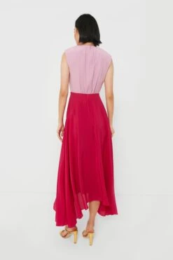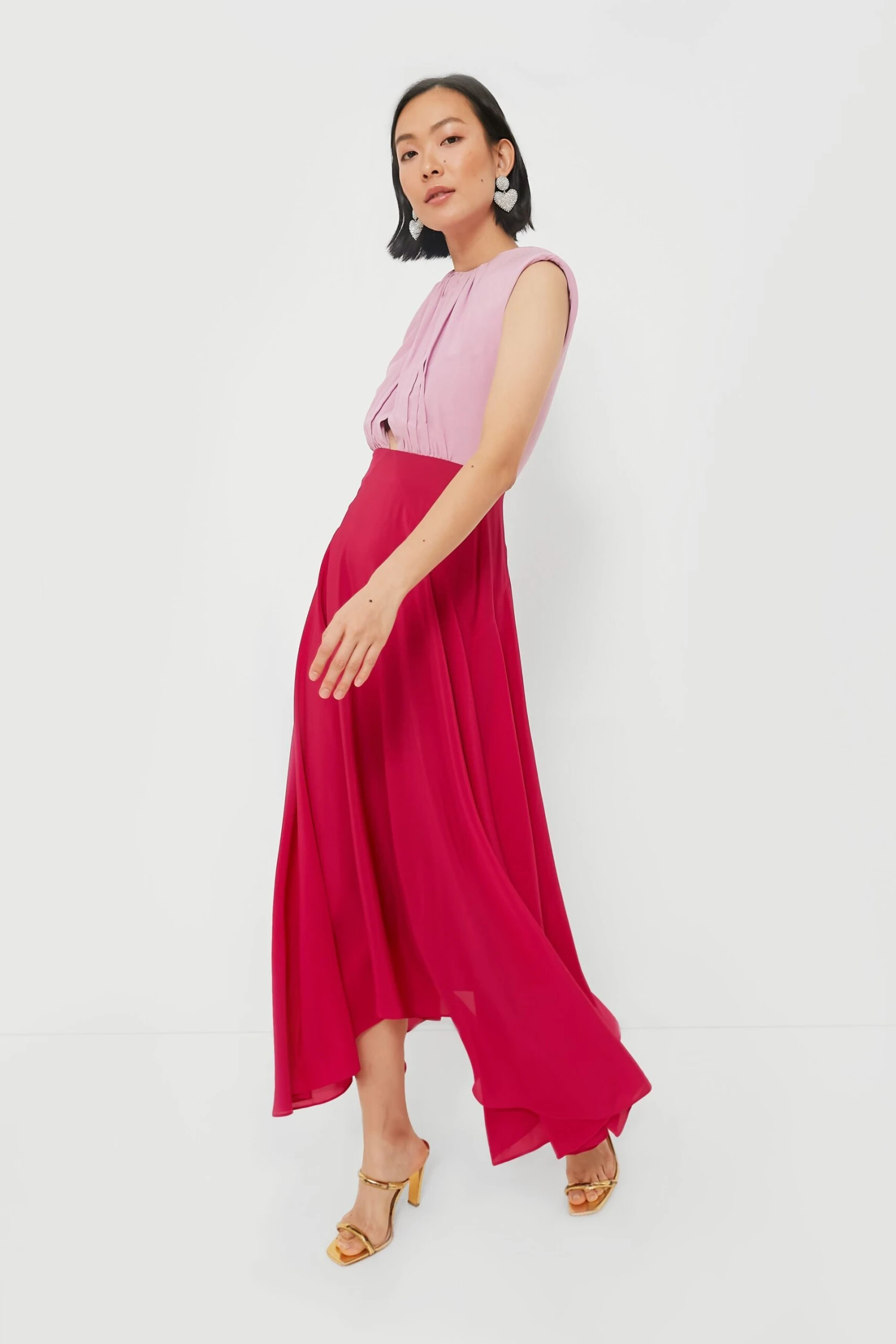 Bring a pop of color to your look with the Light Peony and Raspberry Divya Dress. Delivering an exceptionally flattering silhouette, this midi features a gathered neckline, bold power shoulder, subtle waist cut-out and bias-cut asymmetric skirt. Just wear heels, statement earrings and clutch, and you’re ready to roll for any event on your social calendar!