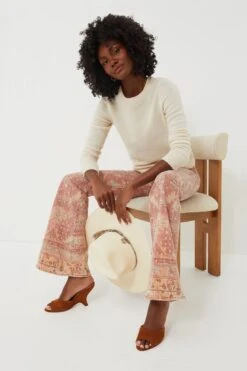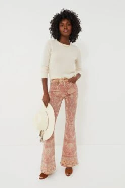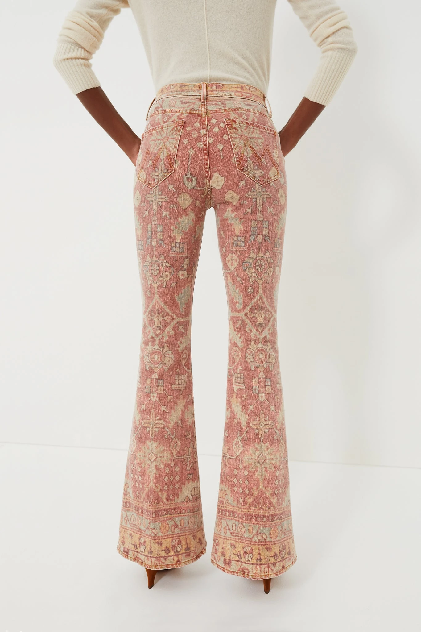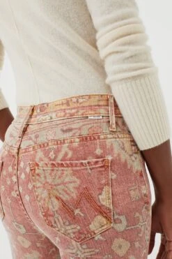 The Rug Burn The Super Cruiser by MOTHER are the statement pants we have all been searching for. With a flattering high rise and flare silhouette, these jeans are complete with a faded Moroccan rug print in soft shades of salmon, yellow, and mint green. Pair with a plain sweater and boots for an eye-catching all-day look.