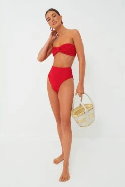 Supportive, seventies, sleek. With a deeper waist band and gathered bow-effect detailing on the top, the Navy Bonnie Bikini has easy retro flair. Made with full bust support and an eye-catching crinkle fabric, this is sure to be your new go-to bathing suit.