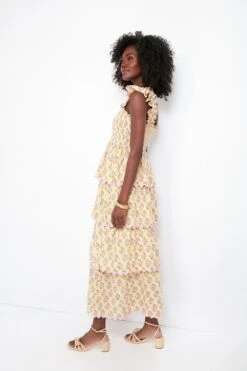 In sweet shades of pale pink and buttercream yellow, the Lemonade Teodora Dress is cut from floaty cotton that is bliss on a sunbaked day. Beyond the charming yet subtle paisley print, what we love most about this silhouette are the feminine details: ruffled shoulder straps, a smocked bodice, and a tiered skirt with ric rac trim that is begging to be twirled. Pair with espadrilles and a clutch for dressier occasions, or with gold hoops and sandals for an elevated everyday styling.