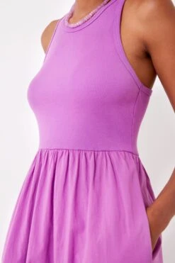 The Purple Orchid Flynn is the dress up, dress down number of your dreams. Made in their classic lightweight woven cotton poplin, this midi has a lived-in look and feel. Our favorite features include the contrast rib knit racerback tank, full skirt, and side seam pockets for all your little essentials. Add sandals for a casual daytime strolls or elevate it with a block heel and gold accessories for date night!