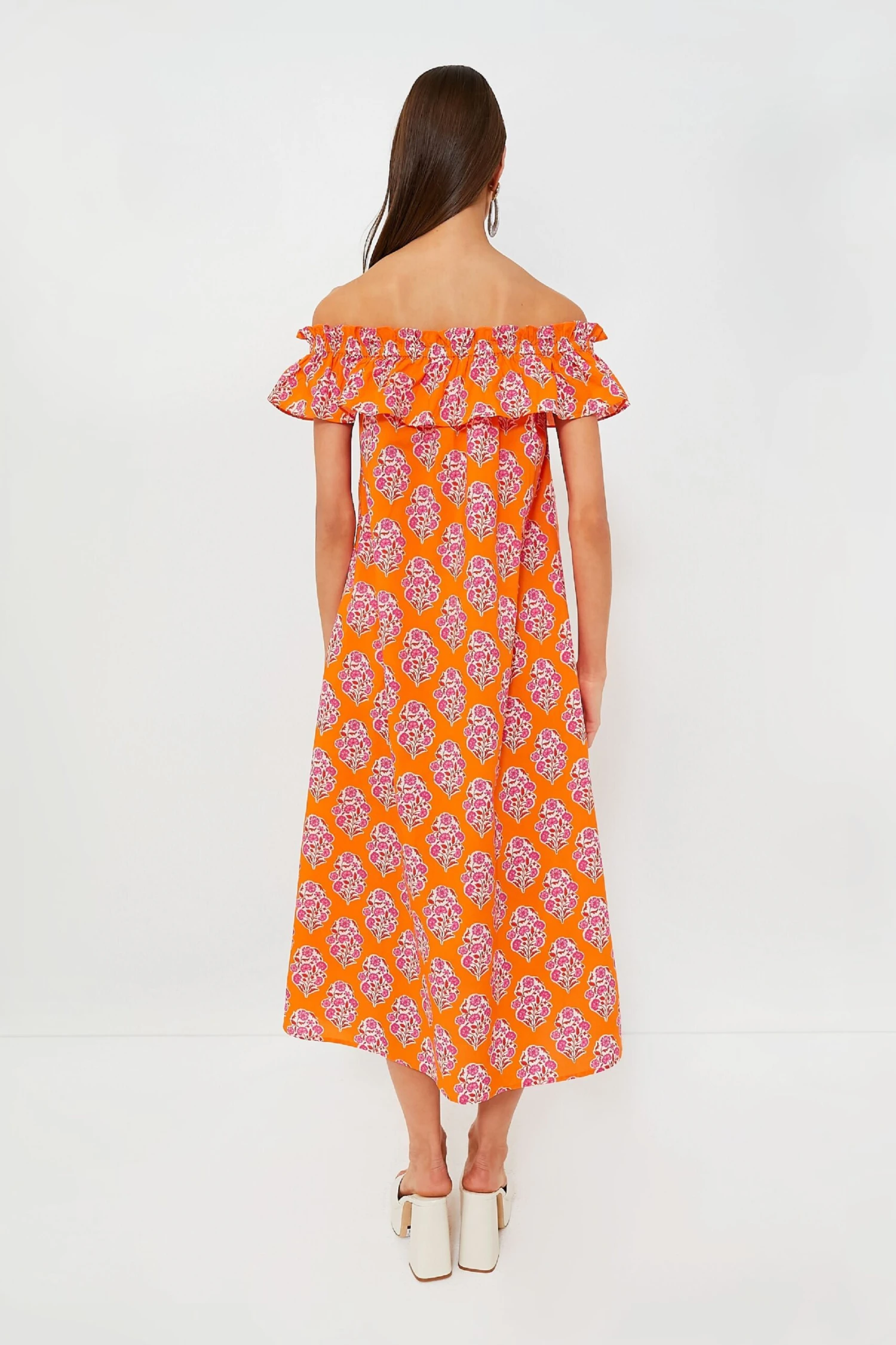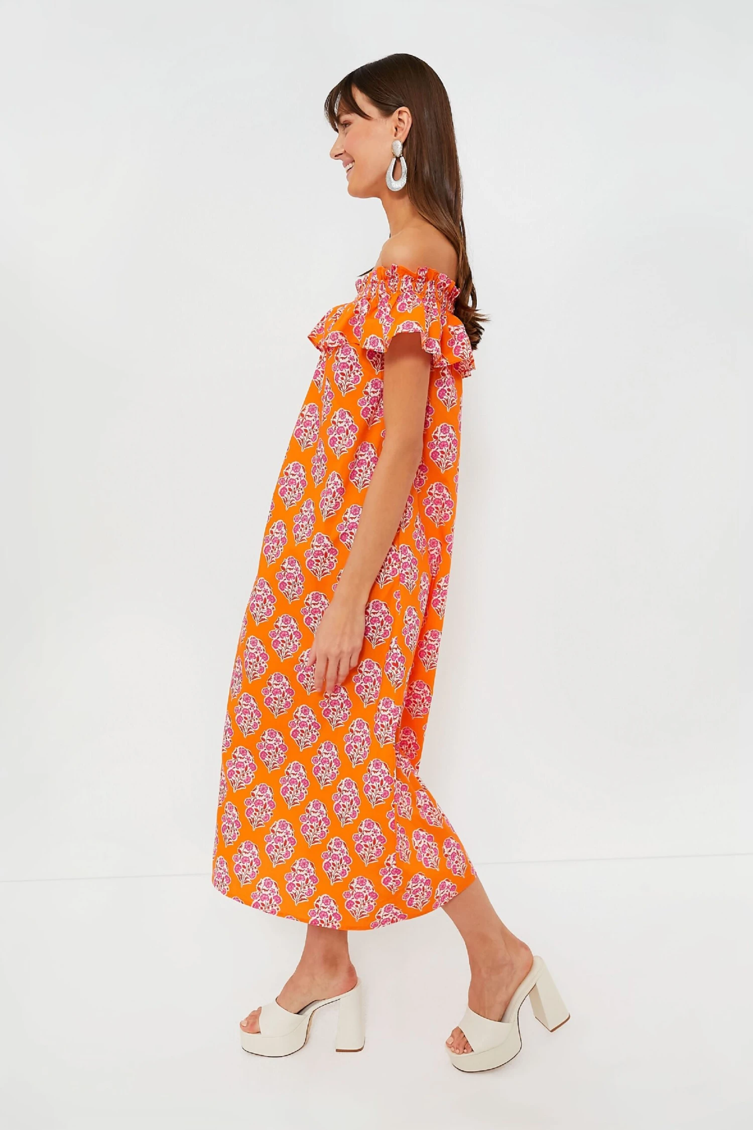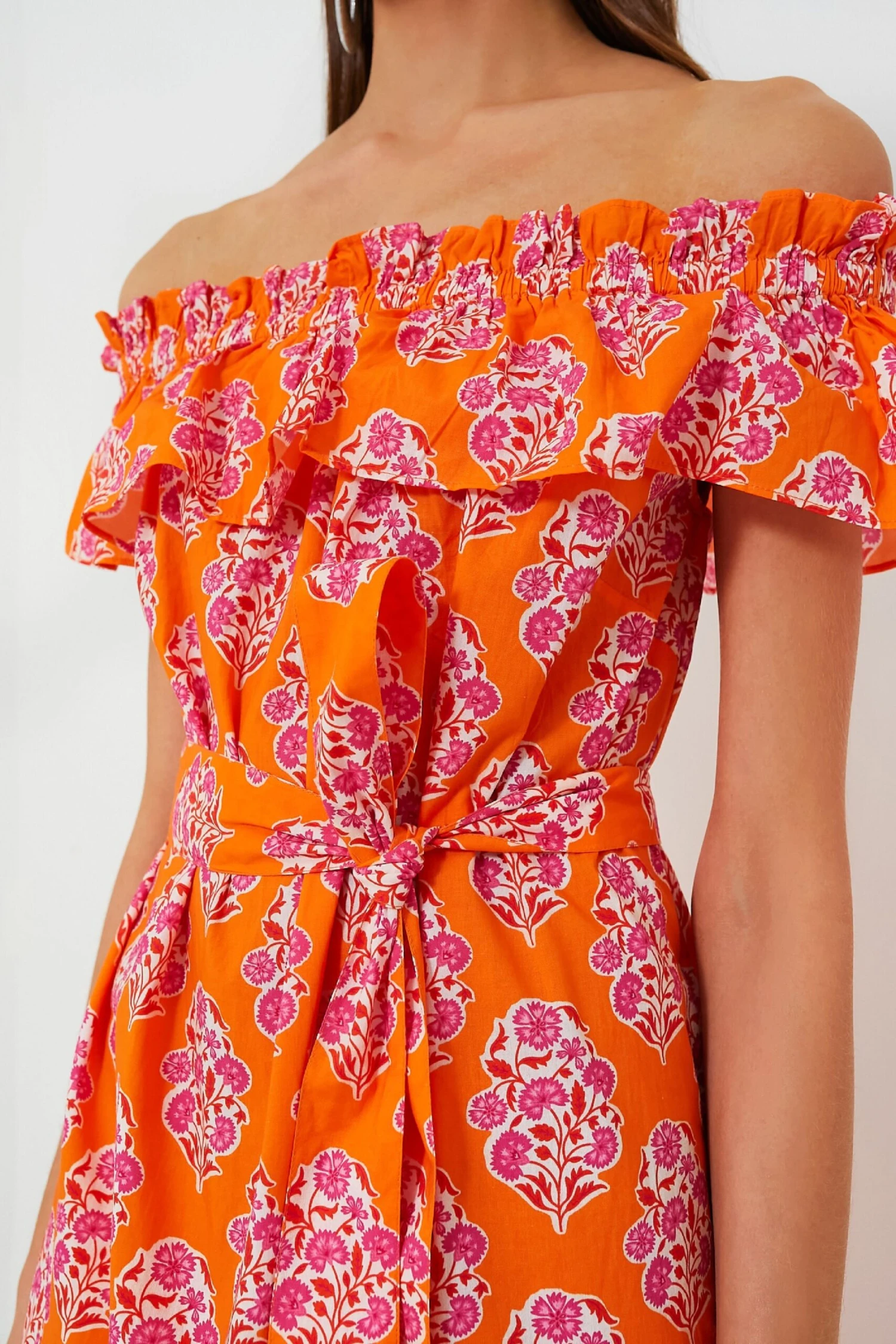Crafted from rich, organic cotton in vibrant Tangerine Buta print, Pink City Print’s new Tallulah dress is a favorite you’ll be wearing on repeat. With an effortless, wafty fit and comfortable, elasticated neckline, this midi looks great barefoot by the beach, or dressed up with the matching waist tie and a pair of sandals. We love the flattering, off-the-shoulder cut and ruffled frill.