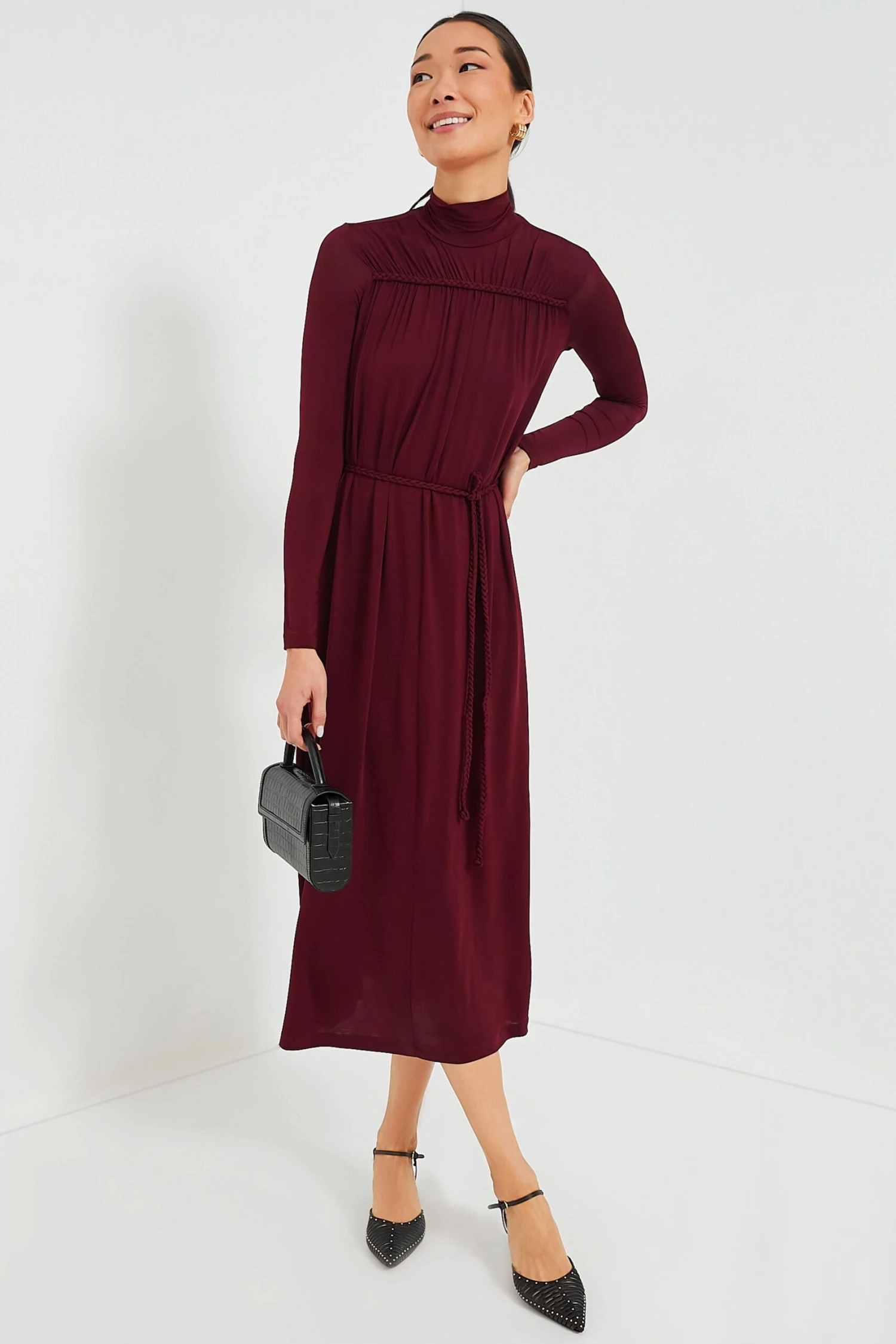 Flowy and glamorous, the Amaro Aleida Dress is an understated stunner that deserves a spot in your closet. This long-sleeve midi features a turtle neck, braided detail on the bodice that matches the belt, which instantly makes us love it more, and its full skirt promotes effortless movement, adding an ultra feminine touch. Pair this stunner with black accessories for a polished desk to drink look, or wear it with gold jewelry and heels for a luxurious formal event look.