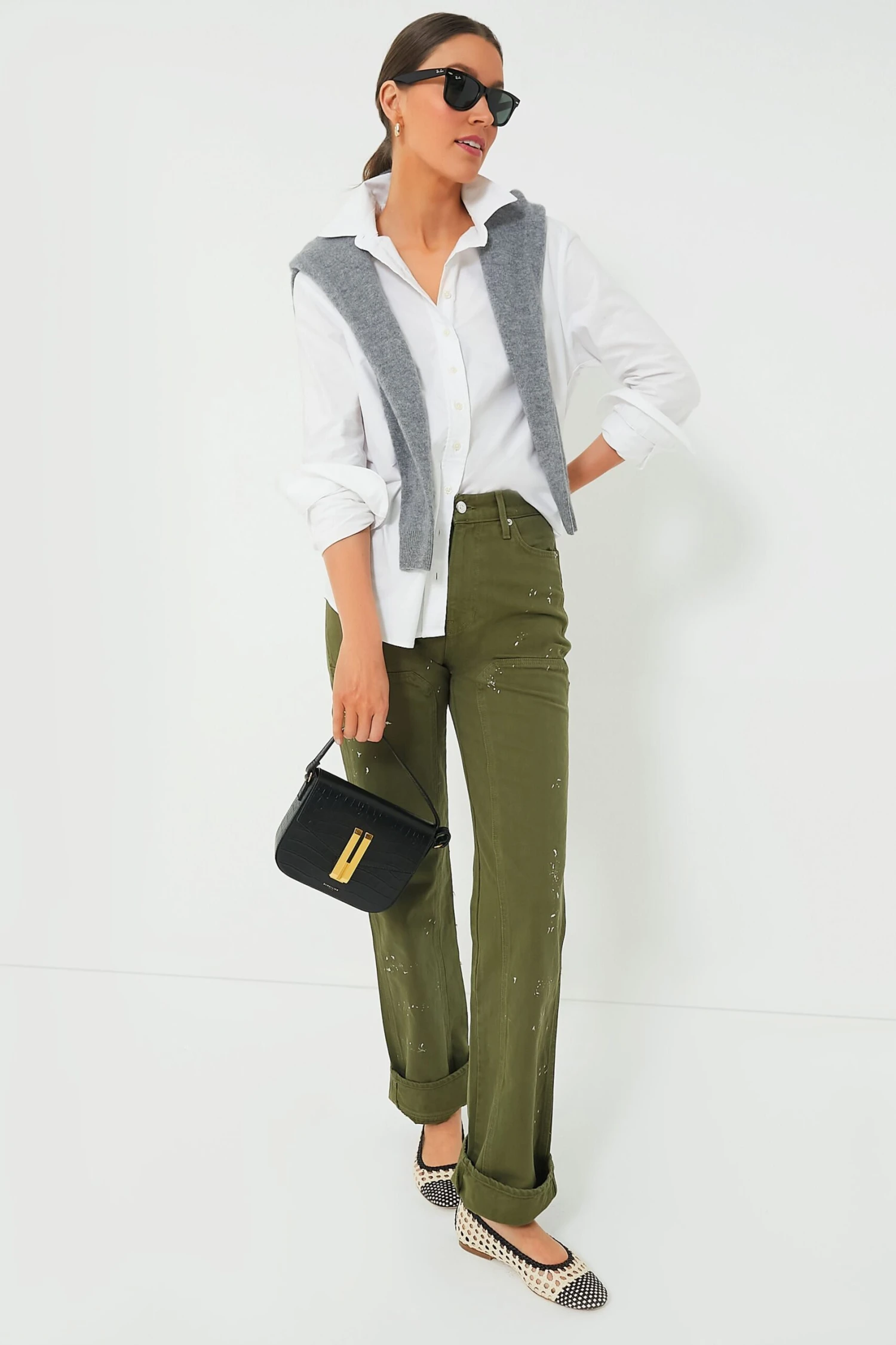 Statement jeans with trend-led details—introducing the Army Dylan Paint Splatter Pant, with oversized patch pockets, cuffs and a paint-flecked look. Contrast stitching, a hammer loop, and Veronica Beard’s signature V-shape belt loop at its back complete the look of this boyfriend-style jean. Style with a tucked-in top and finish with heels for the ultimate downtown cool.